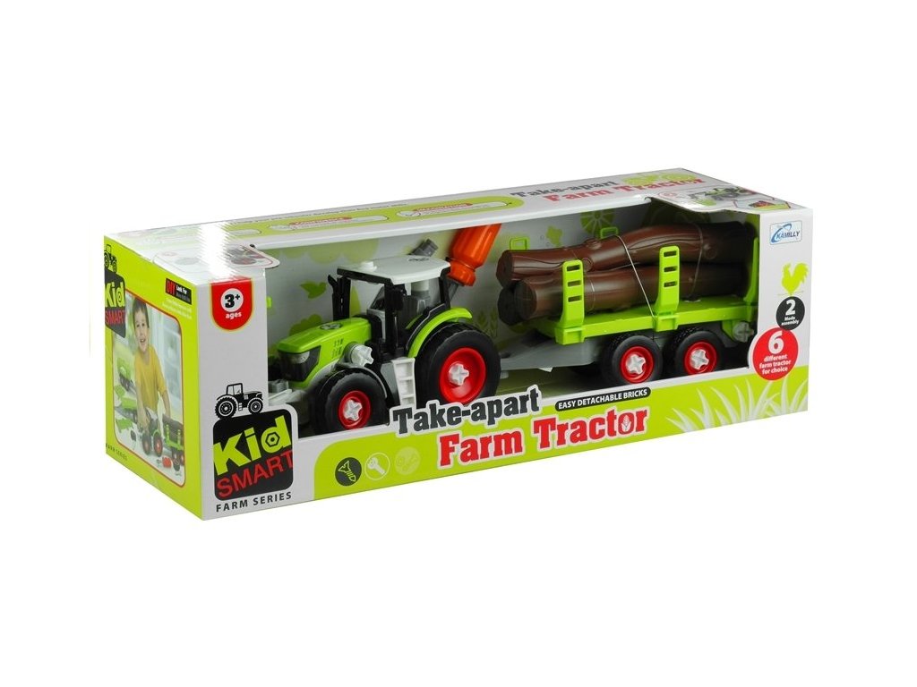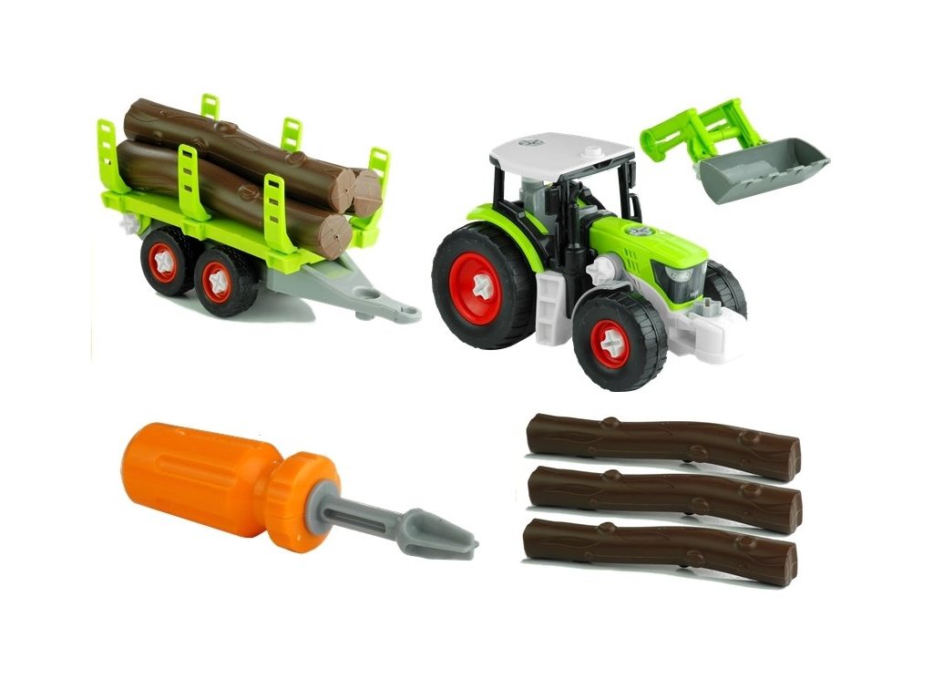 A barkácsolás szerelmeseinek készült készlet egy csavarhúzót, csavarokat, traktort, pótkocsit, fát és egy karot tartalmaz. Az egész műanyagból készült, ami garantálja a játék hosszú élettartamát. A traktor és a pótkocsi műanyag, újrafutózott kerekekre van felszerelve, amelyek forognak. Ezentúl a kisgyermek saját egyéni elképzelése szerint alakíthatja át a járművet.