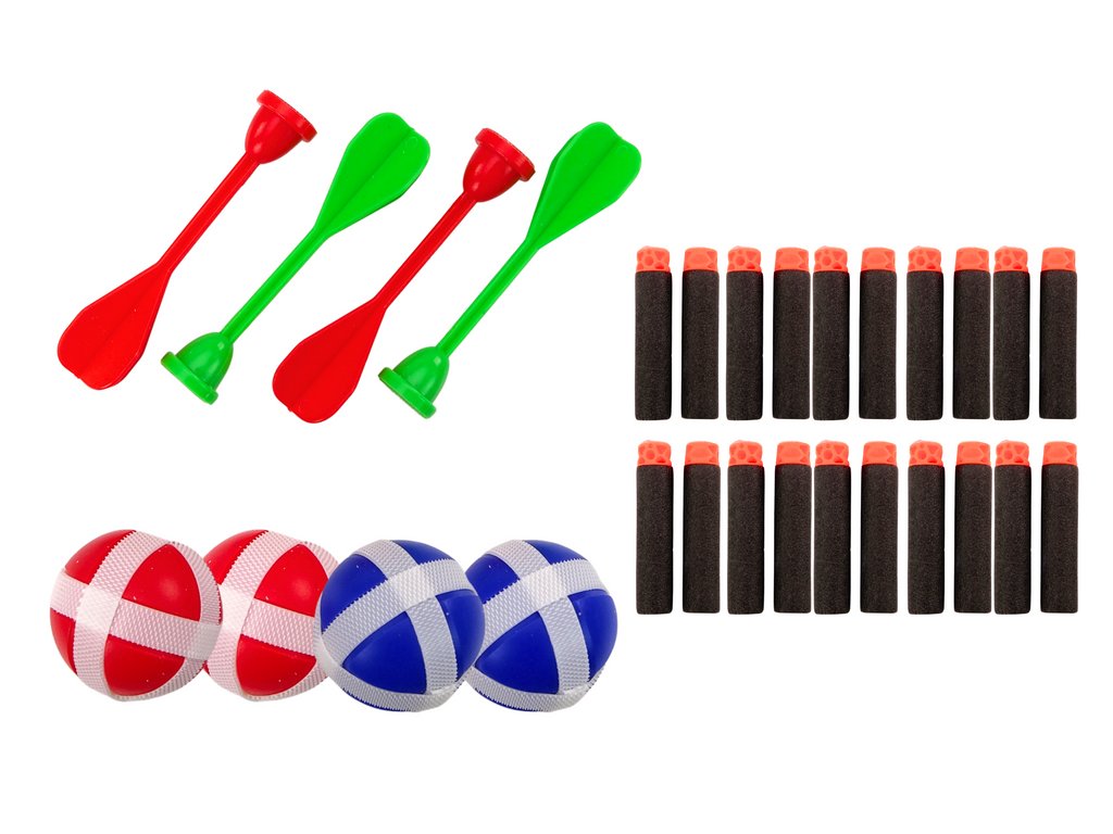 A szórakozás változatosabbá tétele érdekében a készlet tépőzáras labdákat és a fegyvereket helyettesítő dartsokat is tartalmaz.