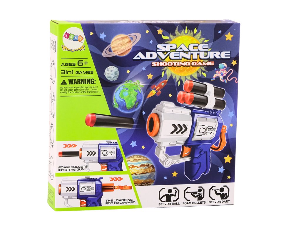 Ahhoz, hogy űrőrökké váljanak, a gyerekek két tépőzáras habos darts fegyvert kapnak. Ezek a pisztolyok biztonságosan használhatók és kiválóak az aktív játékhoz. Nekik köszönhetően a gyerekek pontosságot és reflexeket fejleszthetnek, miközben fejlesztik a szem-kéz koordinációs készségeket.