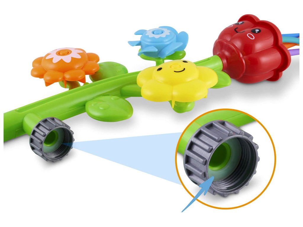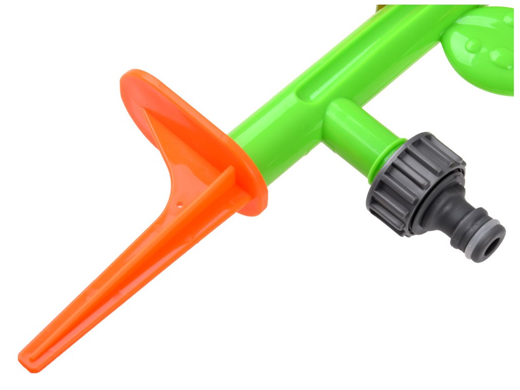 A játék műanyagból készült szép élénk színekben, univerzális csatlakozóval ellátva a kerti tömlő csatlakoztatásához. A játéknak van egy tüskéje is, amellyel a gyepbe tapasztható.